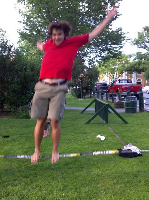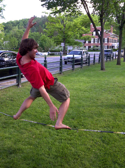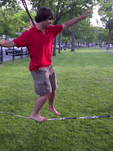 Found out this evening that what you’re seeing is something a little different — an activity called SLACK-LINING. A piece of stretchy dynamic webbing whose tension can be modified is tied between two trees and then the balancing fun and tricks can begin.