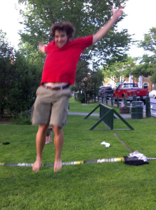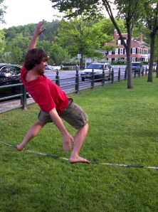 Woodstock’s own Michael Ricci, back for the summer from the University of Rhode Island, has become quite skilled with this balancing act. He says slack lining first gained popularity with climbers and is often found as a sidebar activity at climbing gyms.