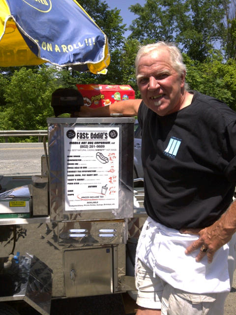 Fast Eddie is available on weekends for private parties. His hot dog stand that is, but a certain amount of entertainment is part of the fun. Coming up soon, he’s using his cart to do a private function featuring steamed lobsters, corn on the cob, etc. Prices negotiable.