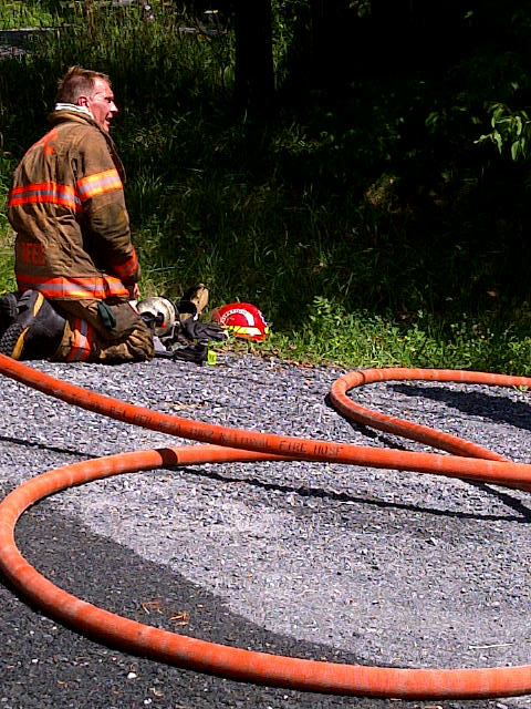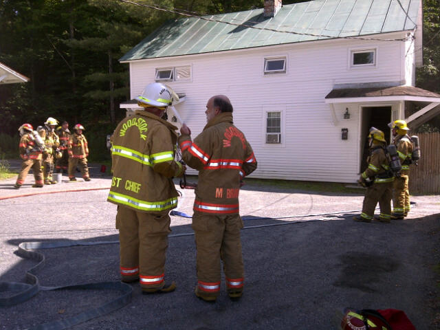 Woodstock Fire Chief L.D. Sutherland, Jr. is on scene and reports the fire started in a closet that contained a hot water heater. Jenks said he detected the smell of electrical burning from the building as he returned from a walk and heard dogs outside barking wildly. Ambulance squads were also on scene to assist firefighters and Woodstock Police were directing traffic at the corner next to Maplefield’s. The fire was just slightly up the hill, about a quarter mile on the right, from the 90 degree turn.