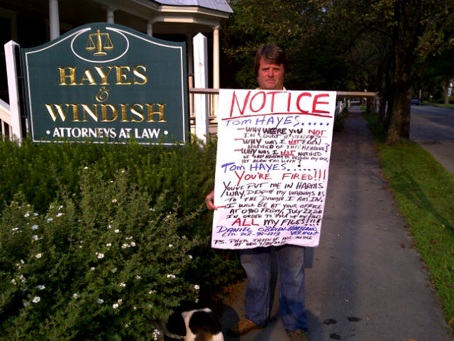 “Tom Hayes…You’re Fired!” Early Bird commuters on Rt. 4 and Central Street in the Village were greeted this morning by Hartland resident Dan O’Brien’s protest sign in front of Attorney Tom Hayes office. He stood with his sign and his beagle with a placard listing a series of complaints against his lawyer who O”Brien said did not appear in court yesterday thereby putting him in harm’s way.