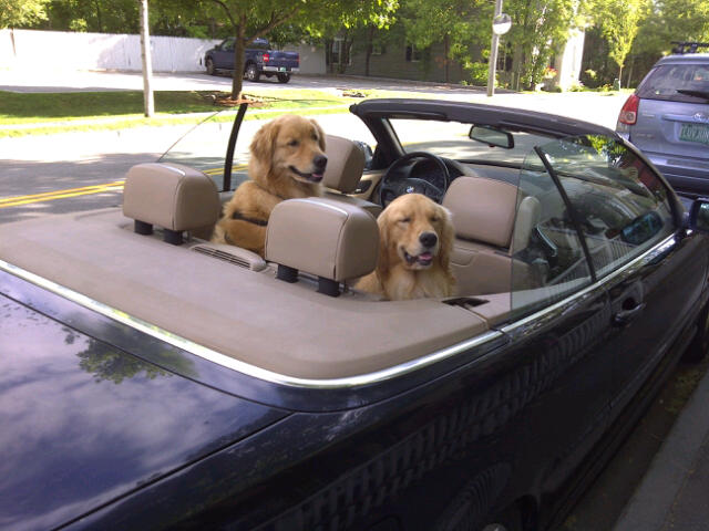 These two Woodstock golden retrievers in the photo to the left are named Cooper and June. They are all harnessed in to their BMW and are going on a drive for a day of blueberry picking.