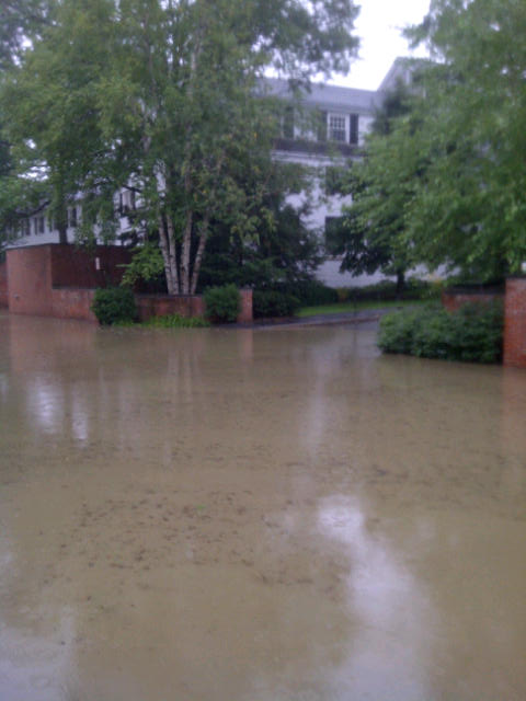 One of the most unusual and dramatic scenes during this Irene deluge is the odd site of water coursing into the lower “Play room” lounge of the Woodstock Inn on South Street — the Route 106 side — and then, moving to the other side of the Inn on Mechanic Street, seeing the water rushing out over the end of the of loading dock in fact it is pouring off of the loading dock.