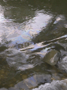 There are eddies where the fuel has created small slicks. Just this morning Woodstock Early Bird had to forego the Community Business Meeting in order to address her own flood questions — the issue of whether we, in our building, might be leaking oil, too. Apparently not, since we took a walk upstream, up the bank and found these similar catchments of oil pretty much anywhere in the Kedron Brook where there are rocks or branches or indentations in the banks.