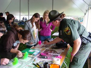 Woodstock Police Department’s own “Officer Jen” — oh, yeah, that’s really “Officer Hutchins”, presented “Get a Lock on Law Enforcement.” The women who attended Officer Jen’s workshop got a taste of forensics by locating, dusting and lifting finger prints – with neon pink powder and making a bookmark to take home. Attendees who worked with Officer Jen also got to try on bullet proof vests, use LASAR (speed measuring device) and other police equipment. Fun, fun, fun but also serious work.