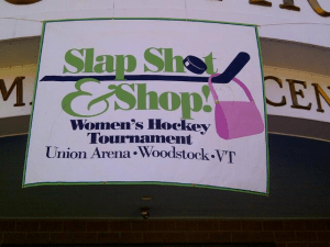 So, the story is this:  women hockey players from Cape Cod and Connecticut come to town to compete in a tournament at Woodstock’s Union Arena. The Village Business Alliance had arranged a deal for these female  hockey players to receive  10 percent off in local shops! Bing0.  We think it might have been a great idea! The “Slap Shot and Shop” weekend obviously brought in visitors who don’t mind things a little brisk and who obviously know how to move in on the puck — or a good deal. It certainly woke up the Village to have these women (and their families) in town during the start of the “dark months”.
