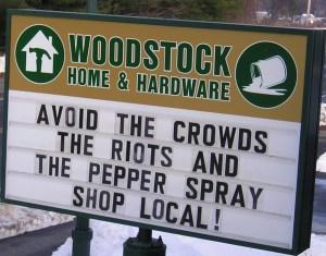 Woodstock Home and Hardware certainly does a good job with its ever-changing signage to keep us thinking (as long as we keep our eyes on the traffic) about our place in the world — whether or not we always agree with Larry’s point of view. As is the intent of Woodstock Early Bird, we support the free expression of ideas, especially those done in a creative way!