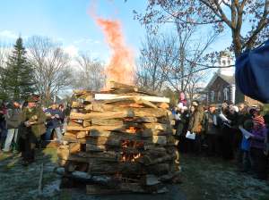 One last Wassail Post of the Day. When Woodstock Early Bird said she wanted a good old-fashioned bonfire by which to warm the toes while the horses paraded she wasn’t expecting a big honkin’ funeral pyre that one might find in India or — closer to home — at some pagan Dartmouth College fraternity party. But, here we have it: If you’re gonna’ build a bonfire, GO BIG!