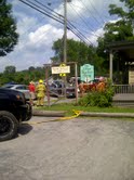 The man, driving a blue pick-up truck with orange traffic cones in the back, appeared to slam hard into a utility pole just outside The Laundry Room on Pleasant Street.  The evidence of the hard hit is the substantial damage to the front end of the vehicle. Woodstock Fire Department responders stood by with hoses ready to douse any engine fire.