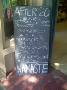 Sitting to the side of Arjuna’s doorway is a faded blue shutter that now, somehow, looks like a prop ready to help shut down the store. To the left of a doorway is a chalkboard , unsigned, but most likely from the always engaging proprietress, Toni, that simply says in so many words: “Goodbye.”