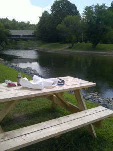 Woodstock Early Bird stopped for lunch at the picnic table yesterday and while dining on a George’s sandwich enjoyed the view of the Covered Bridge, Mt. Tom , the beautiful greens of Vermont and what is — once again- a peaceful setting along the banks of the now lazily-flowing Ottauquechee.