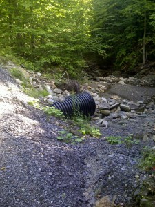Now, Barnard will have it BIGGER (with the 12-foot diameter pipe) but who will pay the difference in price? After checking out the structure and taking a drive up to Alice’s Turnaround we kinda’ wondered about the scale of the structure ourselves. Obviously Woodstock Early Bird knows next to zero about road engineering or about stream habitat but let’s just say it sure seems like the “Feng Shui” of the structure is a little “off” for where it’s going.