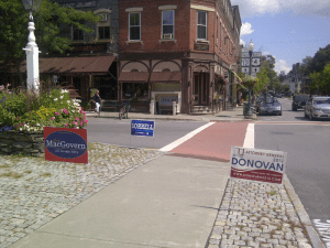 We did get Town Clerk Jay Morgan who addressed the signage directly in front of the Town Hall. He says the Town has always allowed the two grassy areas at the entrance to the building to be used by any political candidates or their helpers. However, a couple things: 1) No signage can be affixed to the Town Hall itself and 2) No one may impede the path of voters into or out of the building. Discussions, chit-chat and hello’s must be made clear of the sidewalks into and out of the polling place.