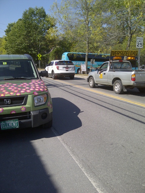 So Woodstock Early Bird was just innocently doing her laundry and checking in with a few key sources when she witnessed an accident waiting to happen: The convergence — just like a bad driver ed movie — of a tour bus not able to properly make a turn into the overflow “Jungle” parking lot and preparing to back up JUST as an over-sized load was also coming through town around Maplefield’s Corner (We KNOW, it’s not really Maplefield’s Corner, but everyone with an institutional memory is getting on)….