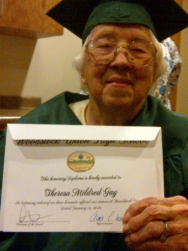 Today, at the age of 103, Theresa Mildred Gay, accepted an honorary diploma from Woodstock Union High School.