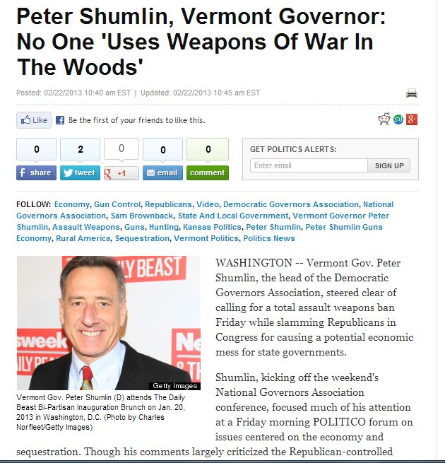 Woodstock Early Birds, since we are focused on “shooters” today with our visiting law enforcement officers, here is a link to an article in The Huffington Post on Vermont Governor Peter Shumlin’s Debut as Head of the National Governors Association: