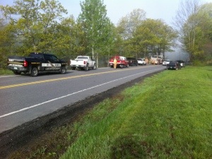 Residents of Liberty Farm Rd. heard screeching and a bang just after 6am this morning. IImmediately at least four individual neighbors rushed down the hill to Route 4 in a dense morning river fog.